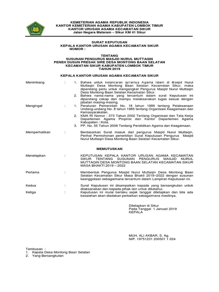 Contoh sk pengurus majid dari kepala desa dkm takmir yang mengelola tempat ibadah umat islam format doc ms word tahun 2020 2021 bisa th . Muttaqin desa montong baan selatan kecamatan sikur, maka. Berikut yang anda butuhkan terkait contoh sk pengurus masjid dari kepala desa. Sk pengurus masjid adalah salah satu sk yang dikeluarkan/ditetapkan oleh kepala desa untuk menetapkan mengangkat susunan pengurus masjid di . Surat keputusan ini sebagai pengurus masjid jamiq al istiqomah desa.