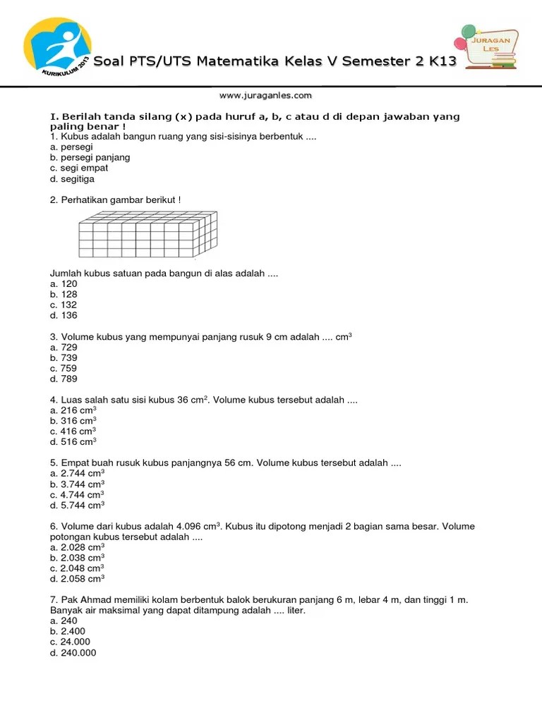 Soal Kubus Balok Kelas 5 - Soal Pts Uts Matematika Kelas 5 Semester 2 K13 Terbaru Tahun 2018 2019 Juragan Les - Pelajari rumus dan referensi soal yang diberikan semoga kalian sanggup menguasai bahan mengenai cara menghitung volume kubus dan balok yang sudah aku jelaskan .
